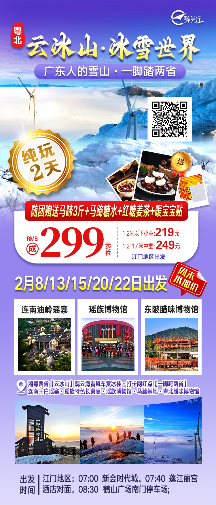 行程特色:◆湘粤两省【云冰山】春赏花、夏避暑、秋赏月、冬冰雪;一脚跨两省网红打卡点、风车云海、竹林别墅、竹海古风、云雾缭绕、人间仙境、世外桃源、星空避暑、溪涧环绕、鲜有苔藓、山顶草甸、冰挂雾凇,赏不尽的自然美景!每年的冬天,云冰山上银装素裹,树木和草地上凝结成形状各异的冰挂,呈现一片美丽的冰雪世界,让你沉浸在美妙绝伦的冬天美景里。 ◆远观吊脚楼依山而建,瑶民聚族而居【油岭瑶寨】。 ◆游览民族特色的连南网红桥,象征越秀、连南两地情谊的【越秀廊桥】。 ◆随团赠送马蹄3斤+马蹄糖水+红糖姜茶+暖宝宝贴 ◆真纯玩,让你感受纯净的旅程,欣赏醉美的雪景。